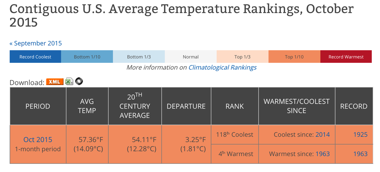 The average temperature in October 2015 was 57.36 F. This was 3.25 F warmer than the 1901-2000 (20th century) average, the 4th warmest October since 1963. The temperature trend for the period of record (1895 to present) is 0.1 degrees Fahrenheit per decade.